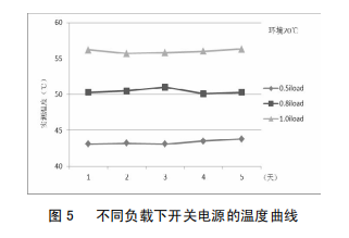 改進后,為驗證改進效果,對開關(guān)電源分別在0.5倍、0.8倍及1.0倍負載下進行了為期5天的帶負荷試驗,圖5為不同負載下開關(guān)電源的溫度曲線,由圖5可知,隨著負荷的增大,開關(guān)電源問題總體呈上升趨勢;負載不變的情況下,同一溫度曲線基本保持平滑;開關(guān)電源在額定負載下運行,最高溫度不超過57℃,未達報警值,開關(guān)電源可靠性得到顯著提高。
