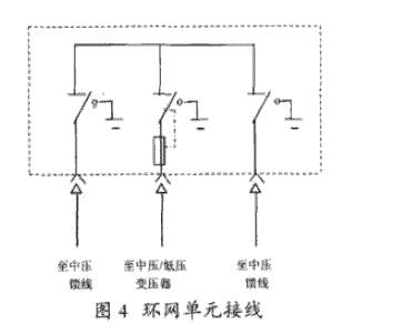 圖4給出了一個(gè)最簡略的全封閉環(huán)網(wǎng)箱的接線圖。中壓饋線的進(jìn)線裝有負(fù)荷阻隔開關(guān),通過一個(gè)串接限流熔斷器的負(fù)荷開關(guān)把變壓器接到環(huán)網(wǎng)體系上,既保護(hù)到變壓器的故障,又能阻隔故障變壓器,使環(huán)網(wǎng)不致斷開。現(xiàn)在運(yùn)用的柜環(huán)網(wǎng)都是在根本接線單元的基礎(chǔ)上改善、擴(kuò)展而成的。