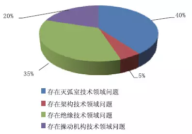 通過(guò)對(duì)固體絕緣環(huán)網(wǎng)柜中心技能問(wèn)題的了解,以為存在滅弧室技能領(lǐng)域問(wèn)題的占比40%;以為存在架構(gòu)技能領(lǐng)域問(wèn)題的占比5%;以為存在絕緣技能領(lǐng)域問(wèn)題的占比35%;以為存在操動(dòng)組織技能領(lǐng)域問(wèn)題的占比20%。如圖9所示。