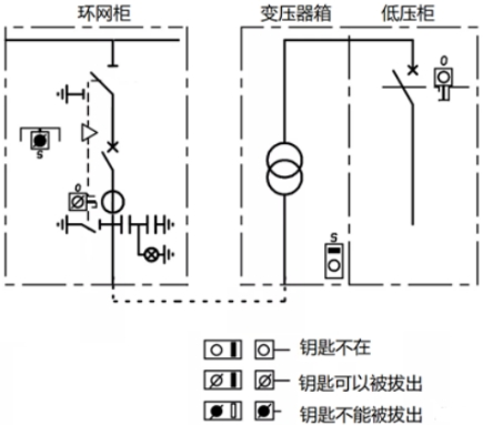 如圖7所示,環(huán)網(wǎng)箱內(nèi)部,阻隔/接地開關與電纜室門之間的鑰匙聯(lián)鎖,電纜室蓋板翻開后,鑰匙被鎖定,不能拔出插入到阻隔開關鎖,即不能操作接地開關;只要蓋板合上,鑰匙才干拔出,去操作接地開關分閘。而體系角度,只要接地開關合閘,鑰匙才干被取出,去開變壓器箱的門,完結變壓器檢修,一起低壓斷路器不能合閘。