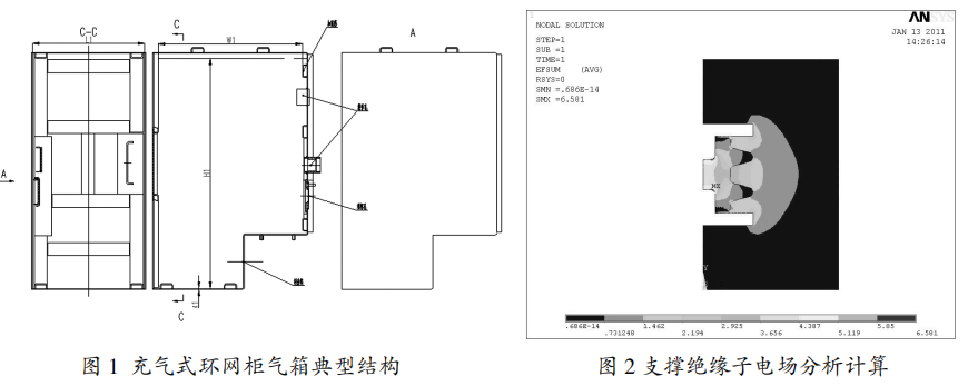 高壓帶電體對地最小空隙處在支撐絕緣子上,通過核算支撐絕緣子的電場如圖2,滿意電場要求,終究確認對地最小空隙。根據(jù)最小空隙準則確認氣箱外形尺度(L1xW1xH1)。