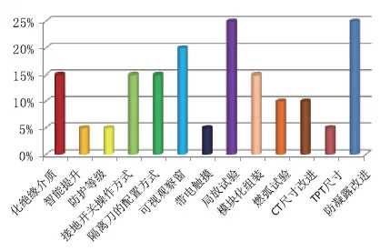 經過調研被參與者心中新產品哪些部分應當進行優化,認為應優化絕緣介質部分的占比15%,智能提高部分的占比5%,防護等級部分的占比5%,接地開關操作辦法的占比15%,隔絕刀的配置辦法的占比15%;可視觀察窗的占比20%,帶電觸摸的占比5%,局放試驗的占比25%,模塊化拼裝的占比15%,燃弧試驗的占比10%CT尺寸改善的占比10%;TPT尺寸的占比5%,防凝露改善的占比25%。如圖15所示。