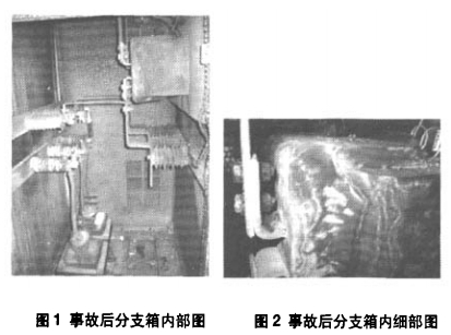 2007年7月18日某地輸配電線路發(fā)生跳閘,在巡線至石板坡電纜分支箱時,發(fā)現(xiàn)電纜分支箱兩端的開關(guān)柜俑壁發(fā)生嚴(yán)峻變形、601進(jìn)線開關(guān)柜面板有飛弧、放電及炭黑等現(xiàn)象。外觀上,箱體內(nèi)水跡明顯。表面柜門已銹死,不得不撬開,操作安排已無法翻滾、只能將其潰散后翻開關(guān)柜門。翻開#601開關(guān)柜電纜室發(fā)現(xiàn):計量TⅣV的熔斷器及支撐絕緣子兩相悉數(shù)炸碎、另一相熔斷器發(fā)生分裂,支撐絕緣子發(fā)生破損,AT表面有爬電痕跡,柜體多處存在放電痕跡,如圖1所示。翻開相鄰距離查看,情況相同嚴(yán)峻,導(dǎo)電部分受潮嚴(yán)峻,銅排及固定鏢栓已長鹵銹,柜體表面有多處爬電痕跡,見圖2。該分支箱為某電器廠制造,2003年投運、僅3年多。