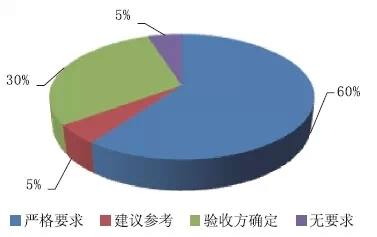針對(duì)參與者所觸摸到的項(xiàng)目,環(huán)繞是否對(duì)固體絕緣環(huán)網(wǎng)柜產(chǎn)品的功用有嚴(yán)格要求與否,認(rèn)為有嚴(yán)格要求的占比60%;主張參看的占比5%;驗(yàn)收方確認(rèn)的占比30%;無要求的占比5%。如圖5所示。