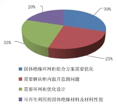 在固體絕緣環(huán)網(wǎng)柜規(guī)劃中,認(rèn)為亟待處理的問題具體有以下內(nèi)容,認(rèn)為固體絕緣環(huán)網(wǎng)柜組合方案需求優(yōu)化的占比30%;需求處理柜內(nèi)溫升監(jiān)測(cè)問題的占比25%;需求環(huán)網(wǎng)柜優(yōu)化規(guī)劃的占比25%;可再生運(yùn)用的固體絕緣資料及資料功用的占比20%。如圖10所示。