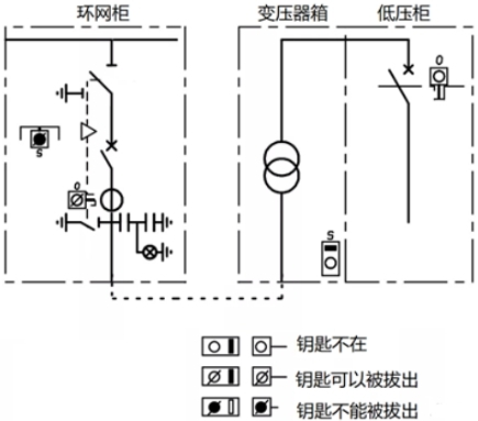 如圖7所示,環網箱內部,隔絕/接地開關與電纜室門之間的鑰匙聯鎖,電纜室蓋板翻開后,鑰匙被必定,不能拔出刺進到隔絕開關鎖,即不能操作接地開關;只需蓋板合上,鑰匙才華拔出,去操作接地開關分閘。而體系角度,只需接地開關合閘,鑰匙才華被取出,去開變壓器箱的門,結束變壓器檢修,一起低壓斷路器不能合閘。