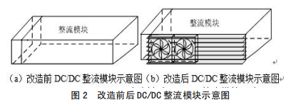 (1)在裝置功率元件一側(cè)加裝散熱片,并于散熱片上面裝設(shè)常規(guī)風(fēng)扇,從而擴(kuò)大散熱面積,增強空氣流通,起到散熱降溫作用,如圖3所示改進(jìn)前后示意圖。