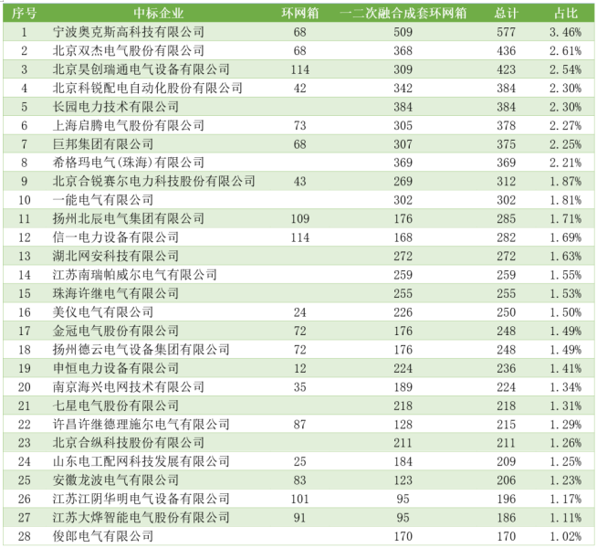 通過環網箱單獨招標中標的企業中,北京昊創瑞通電氣設備有限公司和信一電力設備有限公司市場份額占3.31%,共有6家企業市場份額在3%以上。