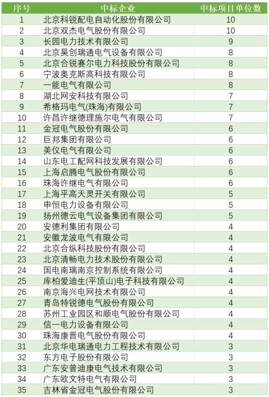 總體中標數量方面,北京科銳配電自動化股份有限公司中標金額達到約2億元;另有4家企業超過約1億元。