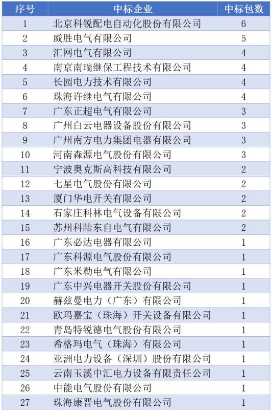 企業中標包數方面,共有15家企業中標2個或以上包數,占中標企業總數的52%。北京科銳配電自動化股份有限公司中標包數最多,共6個包。
